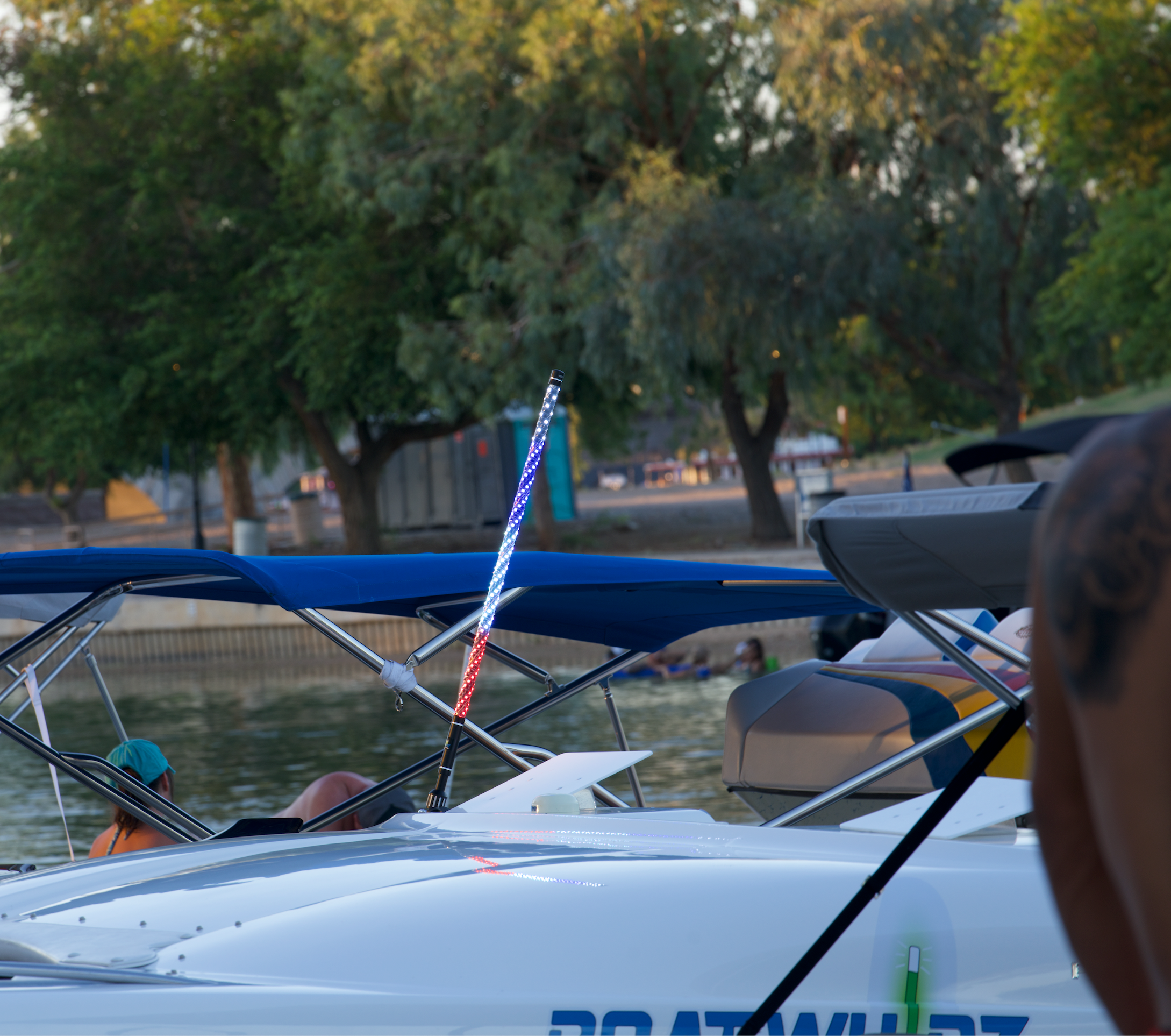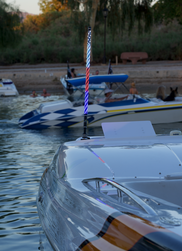 Introducing the BRIGHTEST Boatwhip available on the market today. This colorful spiral wound whip also functions as a stern light! You will be mesmerized by all the colors and design options you must choose from. Simply download the Bledim app and pair it to your Boatwhip. From there you can choose from hundreds of cascading light options, colors, and speeds. You will also have the ability to turn off the colored lights and just use the upper stern light!