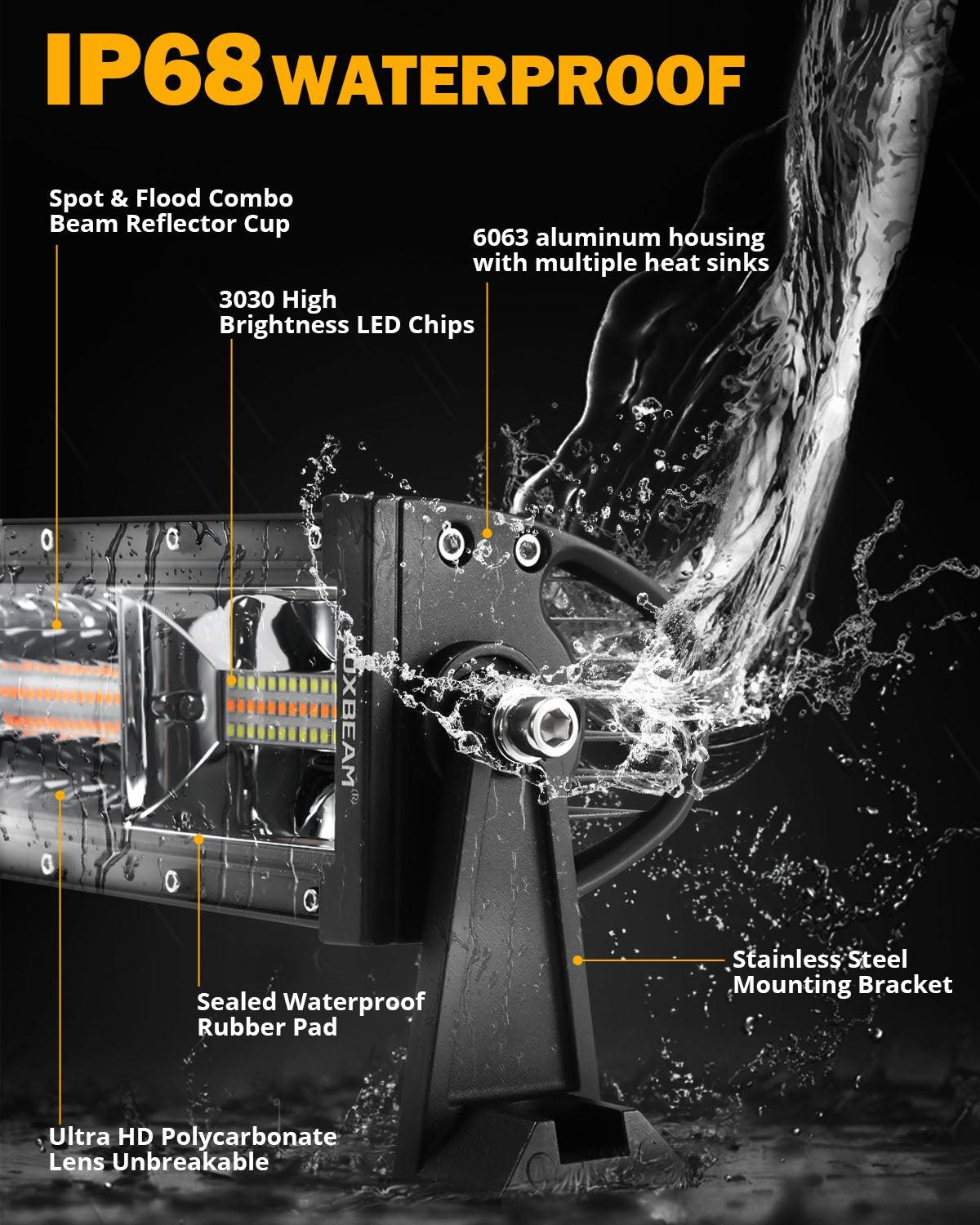 Maximize visibility with the 50” 6-Modes LED Light Bar, offering dual-color lighting (white & amber), three strobe variations, and built-in memory—all operated from a single integrated switch. With a high-output 288W rating and 28,800 lumens, this rugged, off-road LED bar is your go-to solution for illuminating trails, job sites, or emergency scenes—no extra relay or controller required.