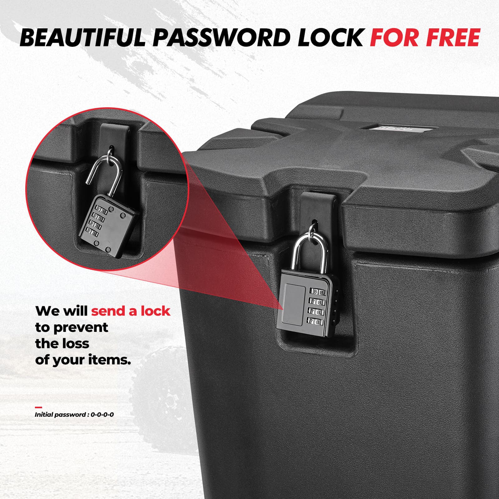 With heavy-duty lid and durable low-density LDPE polyethylene material in textured black, this storage box can bear 100kg+, better leak-resistant and pressure-resistant. Additional combination lock and wire rope can protect your box from being stolen.