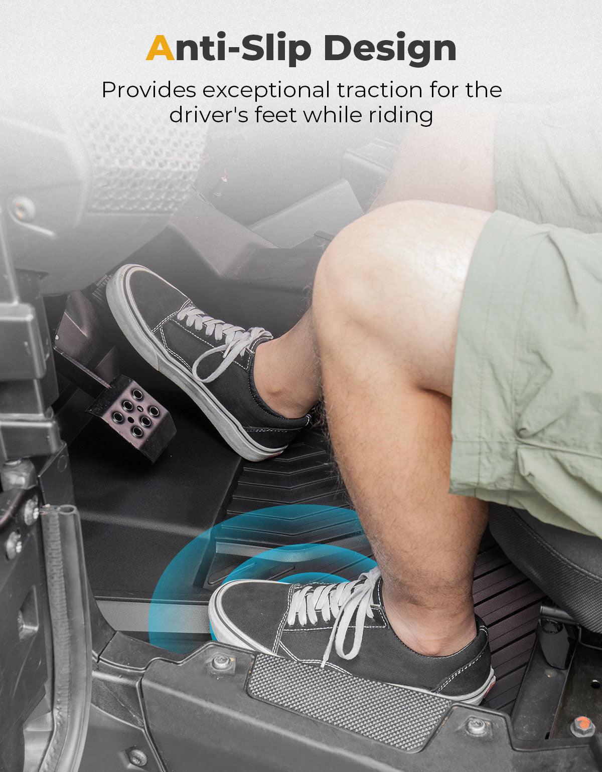 The set includes 2PCS floor mats, one designated for the driver's side and the other for the front passenger's side. Just put them on the UTV floor and press down