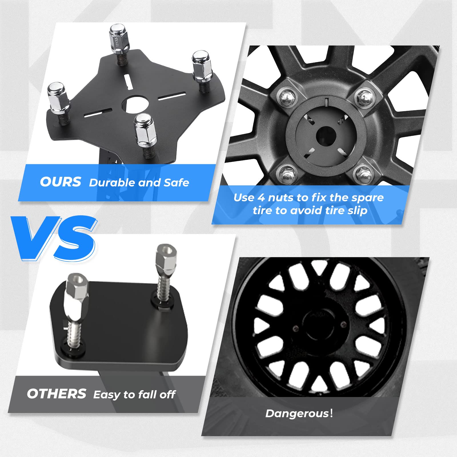 Kemimoto spare tire carrier mounts to the cargo bed. Keep quiet on the trail, no rattles or squeaks. You do not need to drill, take up hitch mount, or attached spare to a roll cage.